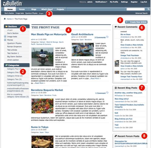 4. Articles. The content here is displayed in the "2x1" layout. "2x1" means 2 articles are displayed in the first row and all remaining content is displayed in a single column. In other sections you will see alternate content layouts like 1 column, 2 column, 3 column, 1x2 (first article spans 2 columns and all remaining articles displayed in 2 columns).