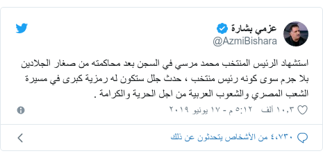 قال عزمي بشارة، مدير المركز العربي للأبحاث، إن: "استشهاد الرئيس المنتخب محمد مرسي في السجن بعد محاكمته من صغار ... بلا جرم سوى كونه رئيسا منتخبا، حدث جلل ستكون له رمزية كبرى في مسيرة الشعب المصري والشعوب العربية من أجل الحرية والكرامة.