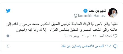 قال أمير قطر، تميم بن حمد آل ثاني، في تغريدة على تويتر: "تلقينا ببالغ الأسى نبأ الوفاة المفاجئة للرئيس السابق الدكتور محمد مرسي .. أتقدم إلى عائلته، وإلى الشعب المصري الشقيق بخالص العزاء .. إنا لله وإنا إليه راجعون".