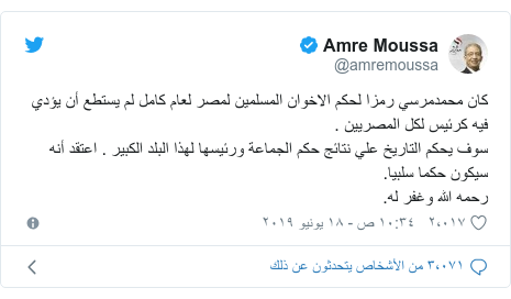 أما عمرو موسى، الأمين العام السابق لجامعة الدول العربية، فقال إن "محمد مرسي رمز لحكم الإخوان المسلمين لمصر لعام كامل، لم يستطع أن يؤدي فيه كرئيس لكل المصريين. سوف يحكم التاريخ على نتائج حكم الجماعة ورئيسها لهذا البلد الكبير. أعتقد أنه سيكون حكما سلبيا. رحمه الله وغفر له".