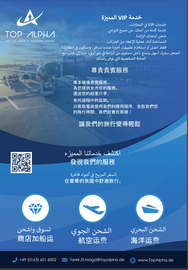 تتميز شركتنا باستقبال المسافريين و كبار الشخصيات و رجال الأعمال و الوافدين في المطارات , توفير أسطول كبير من السيارات الفخمة , حجز التذاكر , شحن الأمتعة و الحقائب و عناصر التسوق , خدمة الإعفاء من الضرائب و الشحن الجوي و البحري بأفضل سعر مميز بالاتحاد الأوروبي .