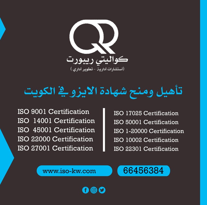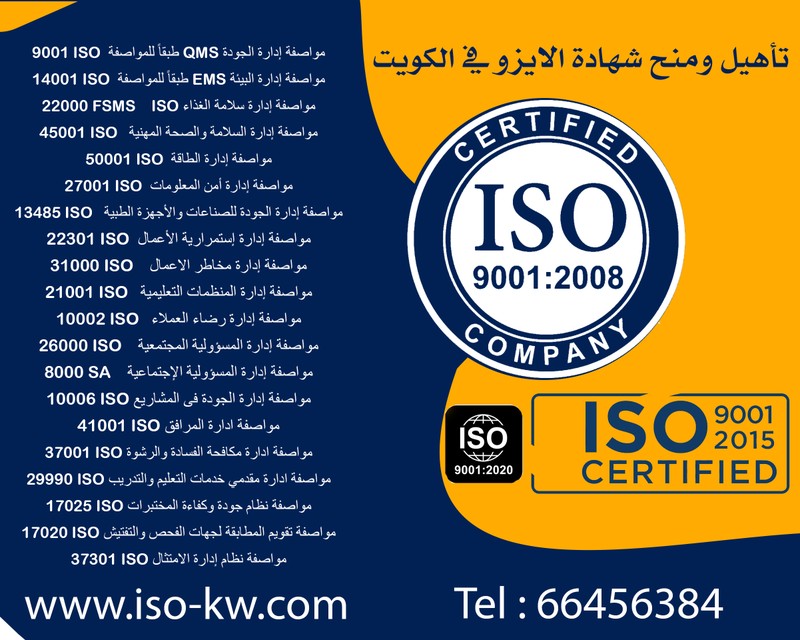 نقوم بتأهيل ومنح شهادة الايزو في دولة الكويت على ان يتم منح شهادة الايزو للمؤسسات والشركات والجهات الحكومية والجمعيات والمعاهد والمدارس وأي كيان قائم بشكل رسمي وليس على مستوي الافراد وتقدم الأوراق الخاصة للشركة من ضمن مراحل التأهيل وان يكون الجهة المتقدمة للحصول علي شهادة الايزو علي استعداد لتطبيق النظام والامتثال لعمليات التطبيق والمراجعة والتدقيق من طرف خبراءنا ومستشارينا