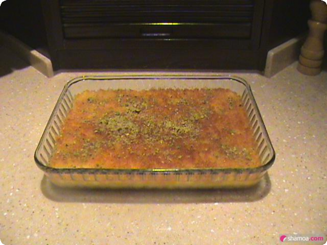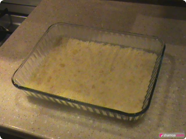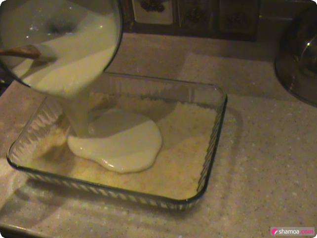 - نضيف خلطة السميد ونسوي السطح بالملعقة حتى يغطي الصينية كاملة.