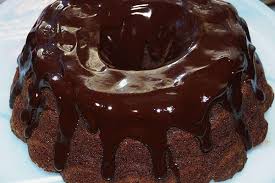 7- بعد تمام النضج، يضاف صوص الشوكولاتة المحضر مسبقًا، ثم يقدم الكيك بارد في طبق التقديم.