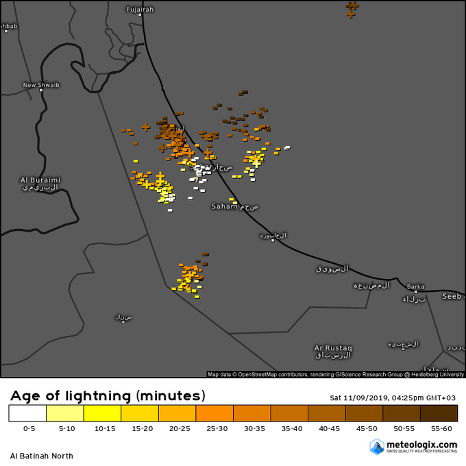 اخر رصدنلاحظ البروق الأن على جنوب وشمال الباطنة تتحرك جنوب شرق الله أعلم