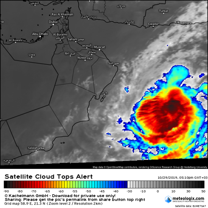 اخر رصد لصور الأقمار الصناعيةللأعصار كيار نمر في بحر العرب
