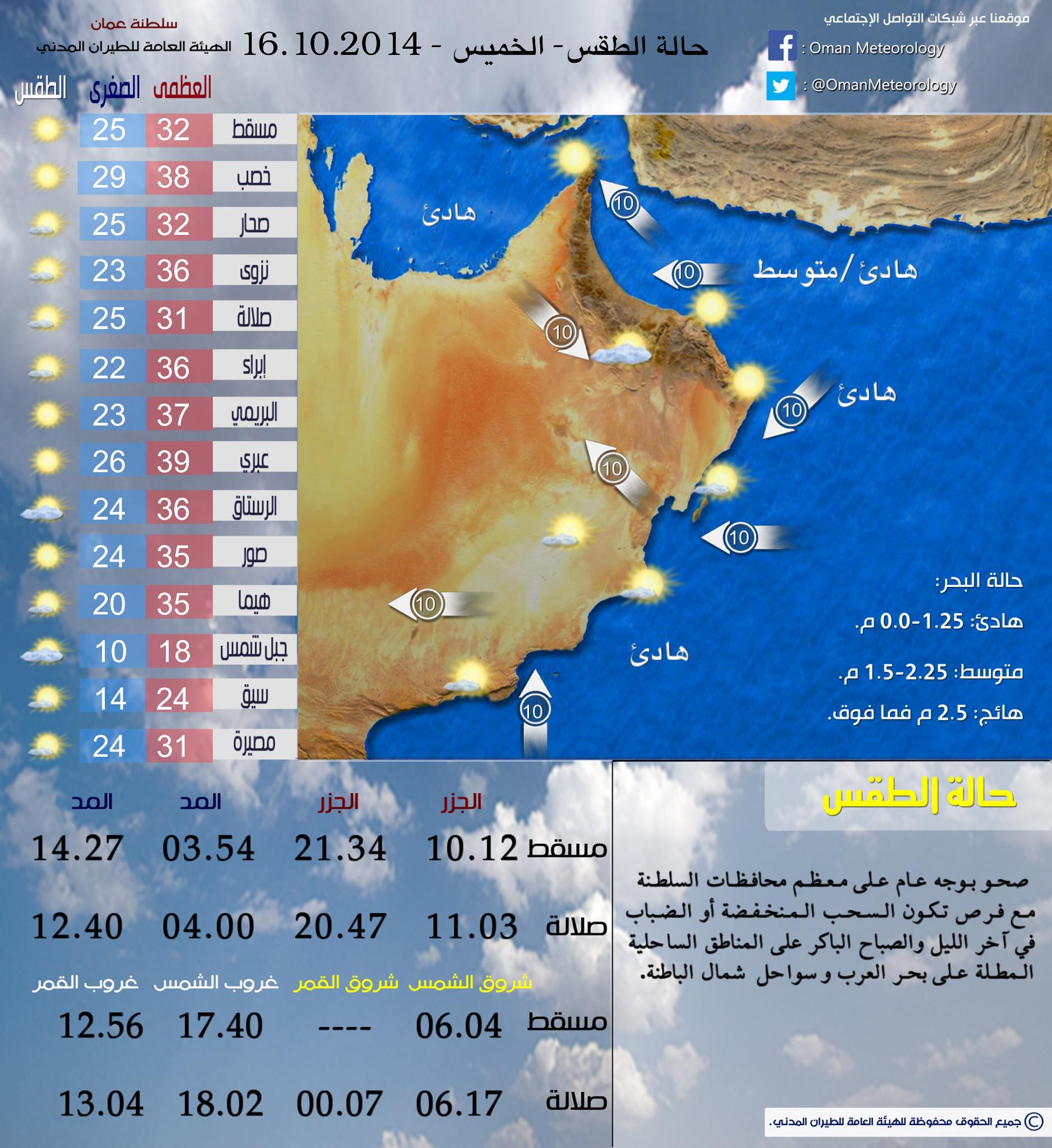 أشارت المديرية العامة للارصاد والملاحة الجوية بالهيئة العامة للطيران المدني إلى احتمالية نشاط التكونات المحلية اليوم وتكون السحب الركامية وهطول أمطار متفرقة قد تكون رعدية احيانا مصحوبة برياح هابطة نشطة وتساقط حبات البرد على جبال الحجر والمناطق المجاورة لها خلال فترة ما بعد الظهيرة. كما توضح آخر التوقعات وجود فرص لتكون السحب المنخفضة أو الضباب في اخر الليل والصباح الباكر على المناطق الساحلية ووجود فرص جيدة لتكون السحب الركامية على محافظة ظفار قد تؤدي إلى هطول أمطار متفرقة.