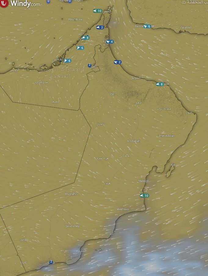 اخر رصدالحركة الرياح السطحية والسحب المنخفضة الان على السلطنة