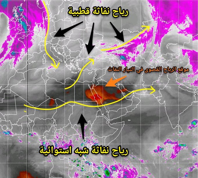 قبل قليل: من مخرجات الاقمار الاصطناعية (بخار الماء): "الرياح النفاثة القطبية عاملة زحمة على المنطقة
