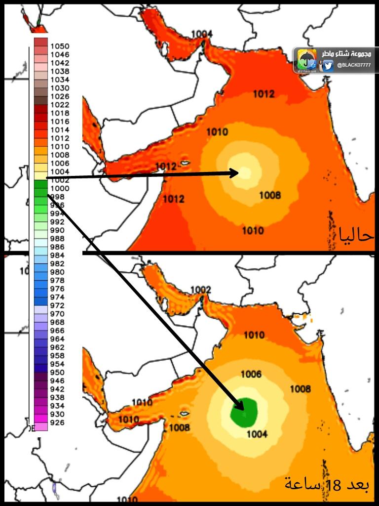 من يوم الاثنين تشتد التيار النفاث الشرقي نحو سواحل جنوب شرق عمان وترفع الحالة نحو الشمال مبتعدة عن اليمن كما انها ستقترب كثيرا بعدها من سواحل الوسطى وستضرب سواحلها مباشرة نتيجة وصول نشاط التيار الشرقي نحو سواحل الوسطى خلال يوم الثلاثاء بشكل مباشر.. كما انها ستكون ببيئة مناسبة لتطور الحالة امام سواحل الوسطى الى مستوى عاصفة مدارية شديدة ! ولا استبعد ان تدخل العاصفة اليابسة قليلا , وبالعكس لو لم تدخل اليابسة كما هو متوقع فالعاصفة ستحافظ على قوتها , وبعدها تنحرف العاصفة شمال شرق بمحاذاة سواحل الوسطى والشرقية نتيجة انجذابها لاخدود قوي منحدر من منخفض وسط سيبريا القطبي .. وعندما تصل الحالة الى المنطقة الشرقية بعد الثلاثاء سيتفاعل مع العاصفة حوض بارد شتوي !!