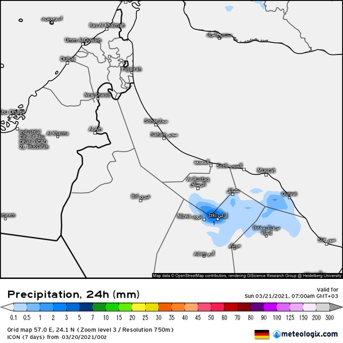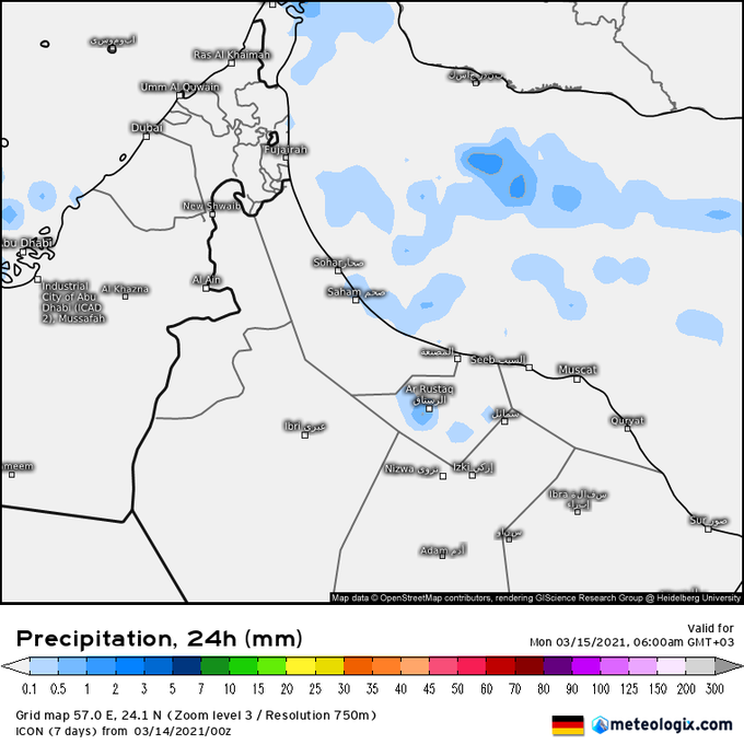 تحديث صباح اليوم من نموذج الألمانيالتوقعات الأمطار خلال 24ساعه القادمة على جبال الحجر العمانية الله أعلم