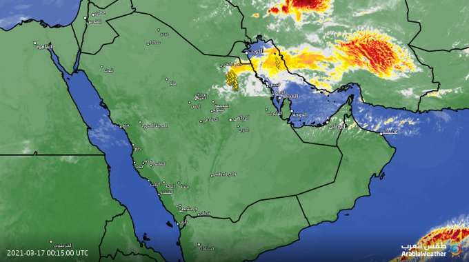 اخر رصد لصور الأقمار الصناعيةنلاحظ نشاط خلايا ماطرة على الكويت وايران